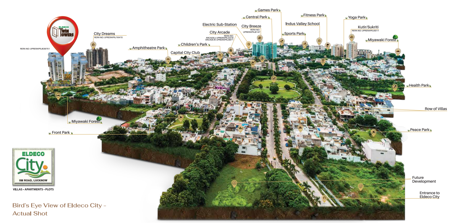 This high-rise residential complex with 2 & 3 bedroom premium apartments nestled in the 133-acre dazzling township of Eldeco City township on IIM Road, Lucknow, is blessed with a landscaped park, open spaces, rows of trees, and a lifestyle club. The presence of wide spaces and roads within the complex inspires a sense of openness and clutter-free movement.